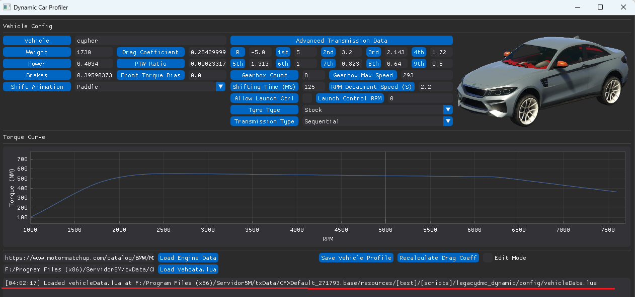 Now, After the engine data has been loaded click "Load Vehicle Config" and select your vehdata.lua file location, on your computer. If you don't have a VPS and instead use FileZilla or other FTP service to upload files to your server, you will need to do this in your local computer, then upload the vehdata.lua to your server.