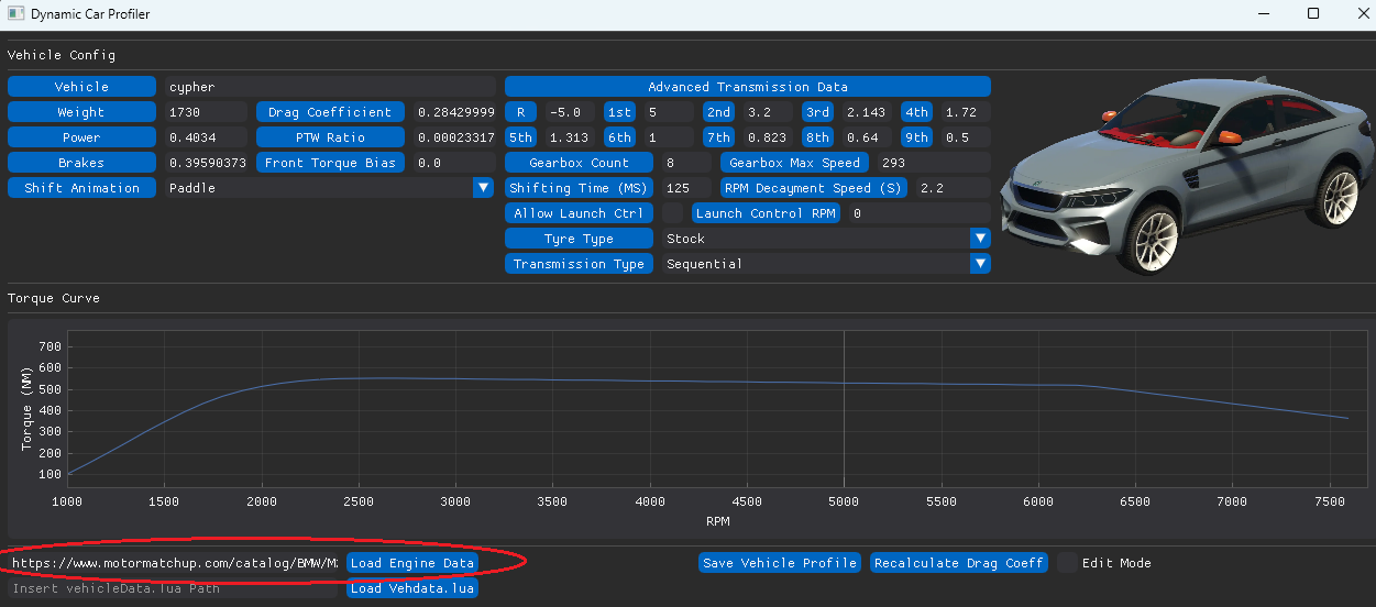 Open the tool and visit [https://www.motormatchup.com/ ](https://www.motormatchup.com/)and select the car you'd like to generate a profile for, once done, make sure you're in the catalog page (page where all details, dyno charts, etc are shown, and paste the link at the text field from the left of "Load Engine Data".